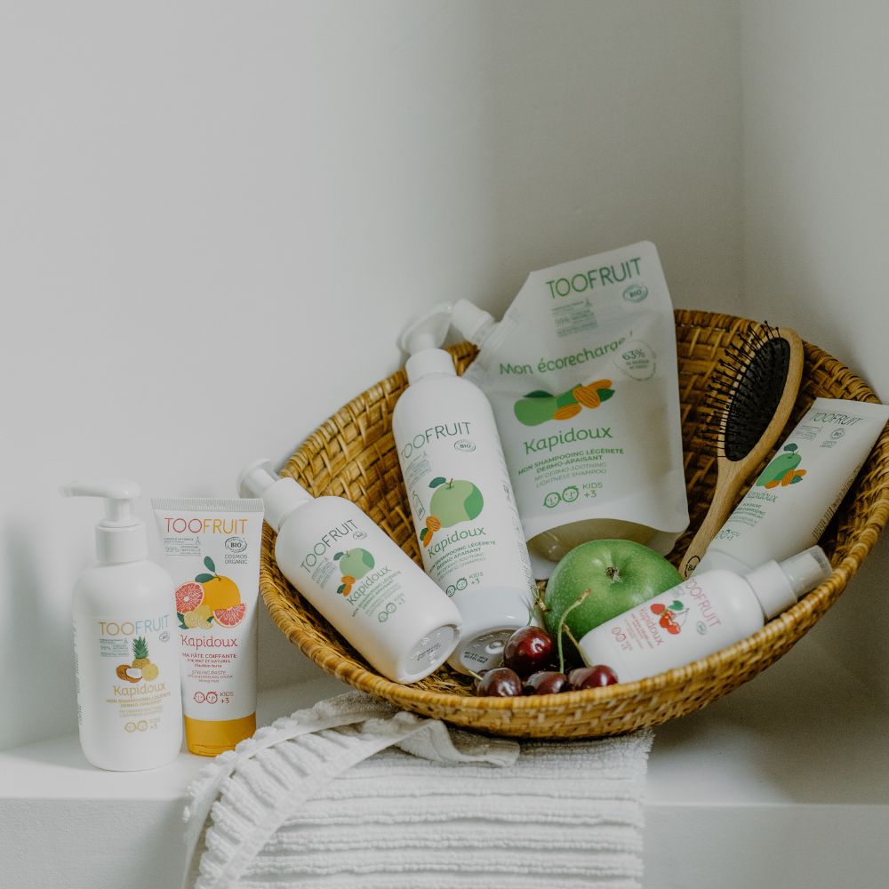 Notre gamme capillaire Kapidoux est certifiée bio et apporte douceur et hydratation aux cheveux des enfants dès 3 ans. Shampooing, baume après-shampoing, spray démêlant, pâte coiffante : découvrez les 4 étapes de notre routine capillaire fruitée, pour des cheveux resplendissants de santé et de beauté !
