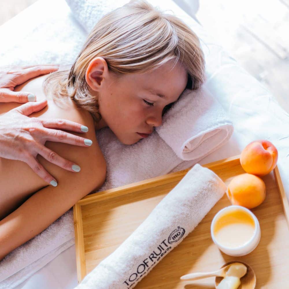 Comme tous les soins pour enfants TOOFRUIT, notre baume de massage bio est par définition un produit sain et respectueux de la peau des enfants, formulé avec 100% d’ingrédients d’origine naturelle et végans. Testé sur peau sensible, il convient à tous les enfants dès 3 ans, pour une application sur le visage comme sur le corps. Il suffit de chauffer le baume de massage entre ses mains et de l’étaler sur le visage et/ou le corps avec des mouvements circulaires, en insistant bien sur les zones tendues, pour ressentir une sensation de bien-être immédiate. En massage pour les plus petits et en automassage pour les plus grands, Douces Papouilles hydrate, nourrit et adoucit en même temps la peau. Parmi les ingrédients naturels qui composent le baume de massage TOOFRUIT, l’huile d’abricot, l’huile de coco et le beurre de karité lui donnent sa texture fondante si agréable quand le soin glisse sur la peau. La camomille, elle, apaise et facilite la détente et le sommeil. Quant à la bonne odeur d’abricot du baume Douces Papouilles, elle enveloppe le corps tout au long de la journée ou de la nuit. Apaisée, protégée, hydratée et adoucie, la peau est au meilleur de sa forme ! Le baume de massage Douces Papouilles s’intègre alors parfaitement à une routine d’hygiène et de soin naturelle pour les enfants. Il s’utilise à domicile ou en institut, lors de la prestation «Mon Soin Relax» spécialement conçue pour les enfants, qui allie les gestes professionnels d’esthéticiennes qualifiées à la qualité des soins pour enfants TOOFRUIT. Retrouvez plus d’informations sur nos instituts et spas partenaires dans la rubrique «Instituts et spas» sur notre site.
