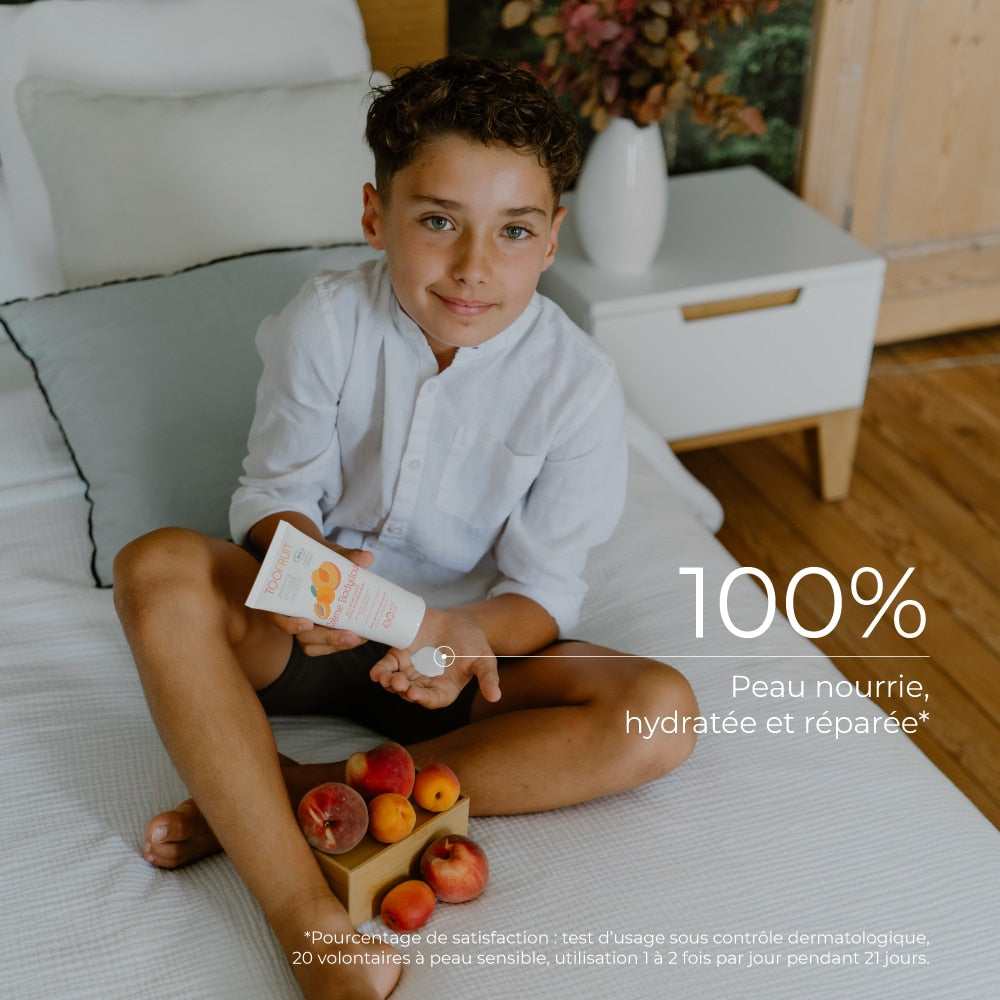 Les produits TOOFRUIT promettent aux enfants une véritable expérience sensorielle. La crème hydratante pour le corps Bodydoux fait appel au toucher et à l’odorat : elle sent bon et vient caresser la peau. Elle laisse aussi la peau toute douce. En fait, la crème hydratante pour le corps Bodydoux est un concentré de super-pouvoirs. Elle hydrate tous les types de peaux, pour une peau aussi douce que celle des pêches qui font partie de sa liste d’ingrédients naturels et biologiques. Elle nourrit même les peaux les plus sèches, grâce à l’action du beurre de karité et de l’huile d’abricot. Elle répare et protège enfin les peaux malmenées par des jeux qui provoquent bleus, bosses et égratignures. Avec l’odeur fruitée de la pêche et de l’abricot, c’est tous les jours l’été sur la peau des enfants ! Associée à la crème Gourmande et au baume à lèvres Bisou Doux dans notre pack Routine Peau Sèche, la crème hydratante Bodydoux a toute sa place dans une routine de soins journalière. Grâce à TOOFRUIT, les enfants ont leurs propres produits d’hygiène. Une crème hydratante pour le corps à l’emballage coloré, au parfum délicat et aux effets agréables est un luxe pour les enfants TOOFRUIT propose également un lait hydratant pour le corps Bodydoux, à la texture extra-fluide et à la douce odeur de mangue. Ce lait hydratant corps permet d’hydrater les peaux normales à sèches au quotidien. De quoi les motiver à filer dans la salle de bains pour prendre soin de leur peau.