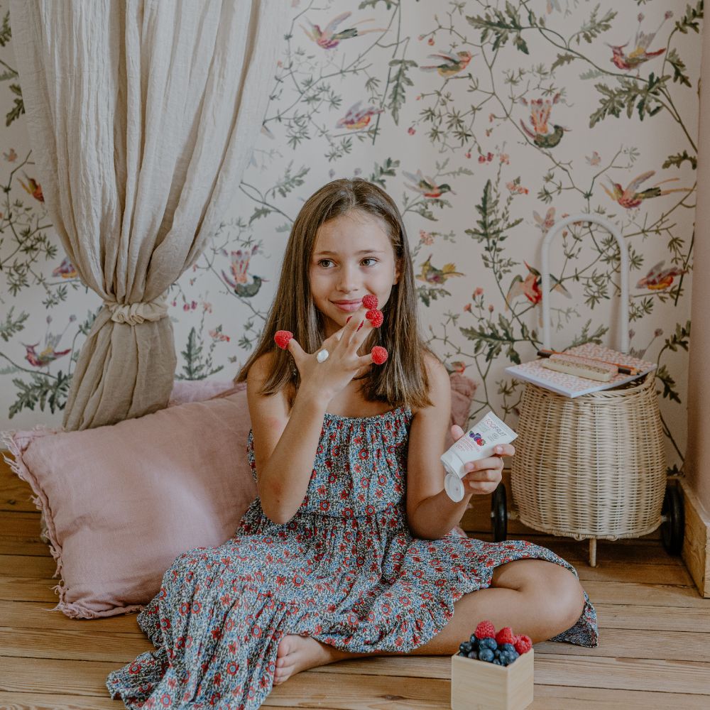 La crème hydratante mains Douces Mimines TOOFRUIT a été spécialement conçues pour les mains des enfants. Sa formule vegan et testée sur peau sensible contient 99% d'ingrédients d'origine naturelle et 30% d'ingrédients issus de l'agriculture biologique. Hyper agréable, elle doit son efficacité à son huile de framboise BIO et son eau de myrtille BIO qui rendent les mains plus douces et confortables. Son parfum de myrtille et de framboise enveloppe les mains d'une douce senteur fruitée (presque à croquer). Grâce à ses ingrédients hydratants et protecteurs, les mains des enfants sont réparées et protégées : l'ingrédient star qu'est l’arnica BIO aux propriétés apaisantes, calmantes et anti-inflammatoires, idéal pour lutter contre la sécheresse des mains. Le beurre de karité BIO à l'action protectrice, adoucissante et restructurante. L’aloe vera BIO bien connue de tous pour ses propriétés hydratantes, apaisantes et anti-inflammatoires. Le bisabolol BIO aux vertus apaisantes, anti-inflammatoires, réparatrices et antioxydantes. Il permet de lutter contre les irritations et les rougeurs de la peau, ce qui en fait un actif particulièrement adapté aux peaux sensibles. Enfin, le prébiotique Bioécolia® (ou alpha-glucan oligosaccharide) qui assure une flore microbienne saine et qui rétablit l’équilibre de la flore cutanée, ce qui favorise la réparation de la peau et la protège plus durablement des agressions extérieures. La crème hydratante mains Douce Mimines s'utilise dès l'âge de 3 ans et peut être glissée dans un sac à dos pour se l'appliquer dans la journée (après chaque lavage de mains par exemple). Et en plus, son tube est en plastique recyclé !