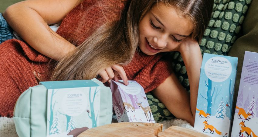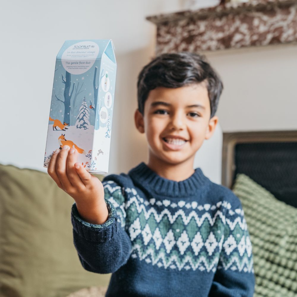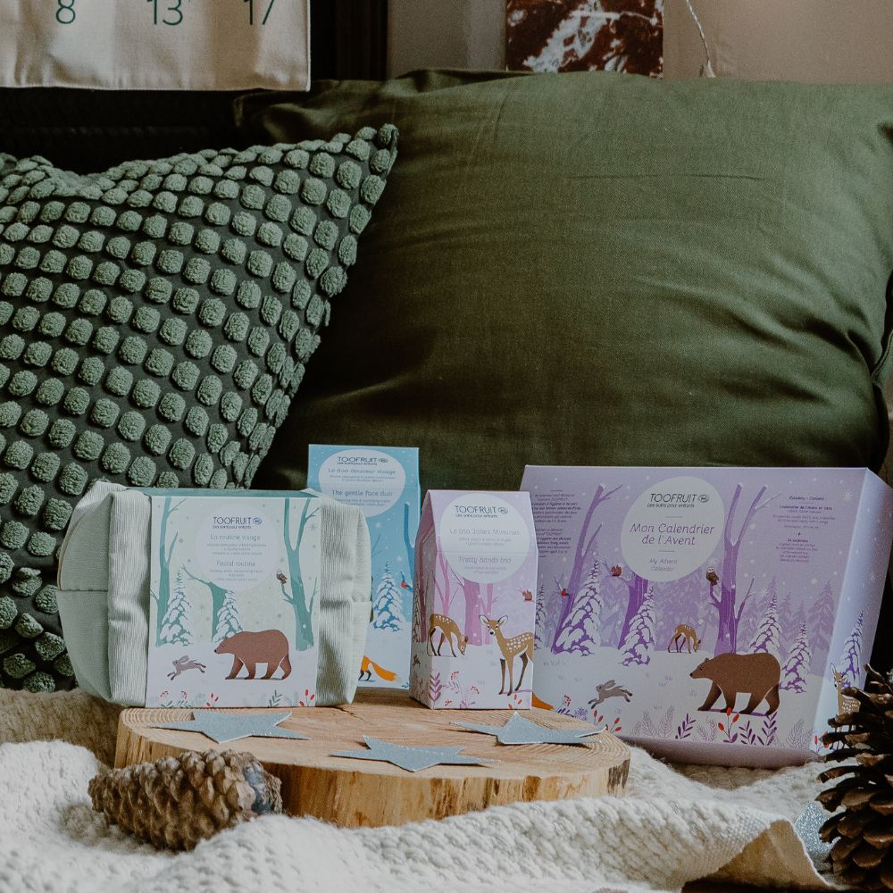Cette année, TOOFRUIT sera assurément le père Noël préféré de toute la famille ! Notamment composés de produits respectueux de la santé et de l’environnement, nos coffrets cadeaux rassurent les parents et mettent un sourire sur les lèvres des enfants, à l’instar de tous les soins naturels et biologiques de notre catalogue. Même en période de fêtes, nos exigences de qualité ne partent pas en vacances : nos coffrets cadeaux de Noël reflètent en effet notre philosophie centrée sur le bien-être, l’hygiène et le confort des enfants, puisqu’ils se composent de nos produits phares, disponibles tout au long de l’année sur notre site ainsi que des petits cadeaux exclusivement disponibles dans ces coffrets. Notre offre de Noël met donc à l’honneur la beauté de la nature endormie, à travers des coffrets remplis de soins tout doux aux parfums fruités délicieusement envoûtants. Trois coffrets cadeaux sur l’univers de la forêt rejoignent ainsi notre boutique de Noël, aux côtés de notre calendrier de l’Avent garni de cosmétiques, d’accessoires et de gourmandises irrésistibles. Ils vous permettent alors de (re)découvrir le meilleur de nos soins pour les enfants, à utiliser en autonomie ou en compagnie d’un adulte au quotidien. En version miniature au sein de notre calendrier de l’Avent, nos super produits vous sont proposés en format classique dans nos coffrets de Noël, de quoi transformer durablement les habitudes et les gestes beauté de votre mini-moi dans la salle de bain. Découvrez sans plus attendre nos coffrets cadeaux à déposer sous le sapin pour un Noël festif, magique et hautement sensoriel.