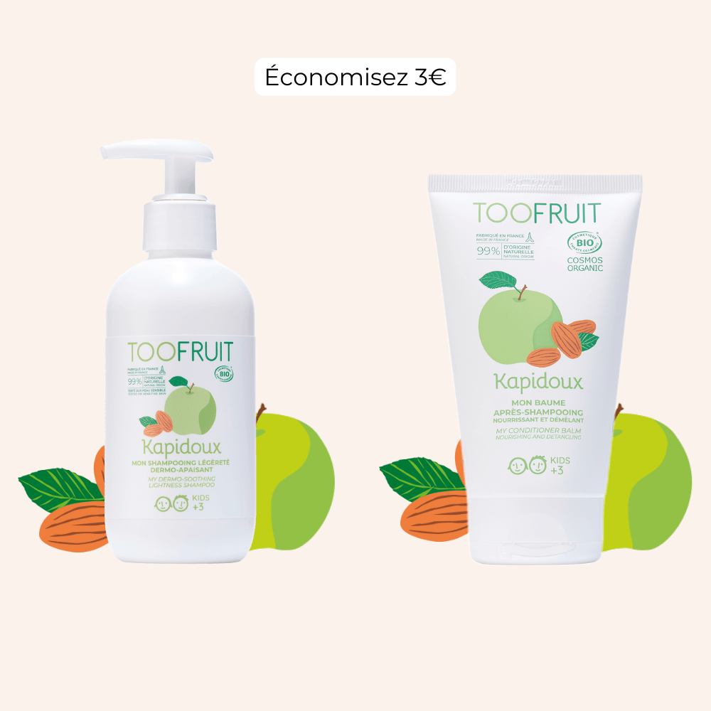 Au quotidien, il est parfois compliqué d’encourager les enfants à passer par la case shampooing et démêlage. Ça pique les yeux et en plus les nœuds résistants tirent les cheveux ! Pour que le moment de se laver les cheveux devienne un plaisir, les équipes de TOOFRUIT ont développé la gamme Kapidoux : shampooing, après-shampooing, spray démêlant et même pâte coiffante, les enfants adoreront prendre soin de leurs cheveux et cela fera aussi le bonheur des parents.