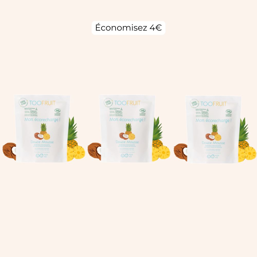 Votre flacon est vide ? Découvrez notre écorecharge Douce Mousse, plus écologique car elle contient 90% de plastique en moins que notre flacon et économique car elle vous fera économiser 20% !